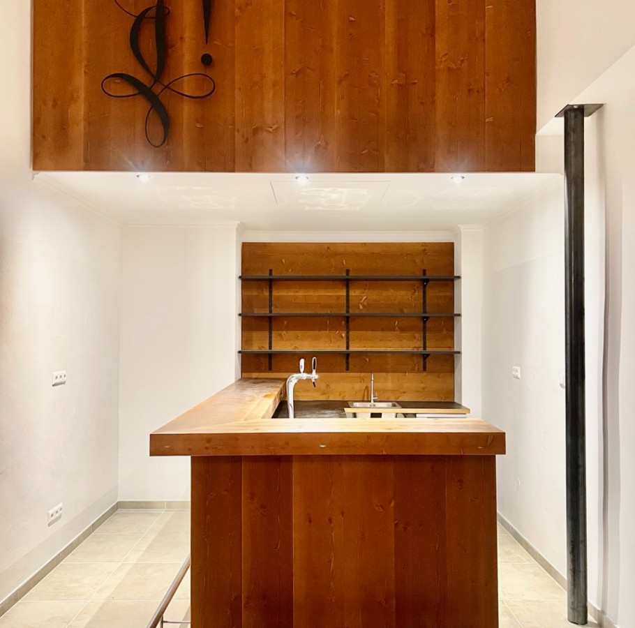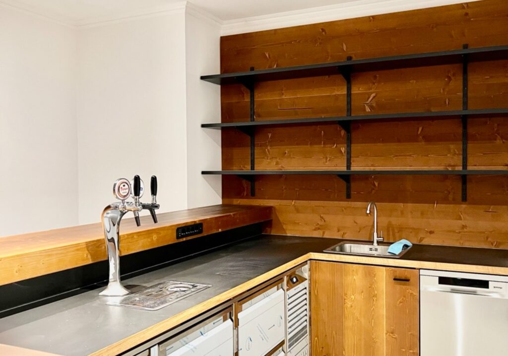 Raumwirkung & Funktionalität Das neue Design löst die vormals beengte Situation vollständig auf: Der Barbereich wirkt jetzt offen, luftig und einladend. Eine großzügige Theke aus massivem Holz mit integriertem Zapfhahn und tiefem Spülbecken bildet das Herzstück. Durchdachte Details wie das unsichtbar integrierte Kühlpult und reichlich Stauraum (hinter und unter der Theke) machen den Bereich zum wahren Platzwunder – alles bleibt übersichtlich und funktional.