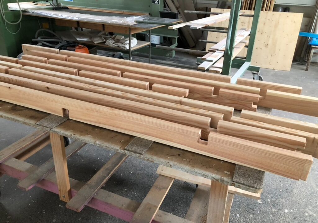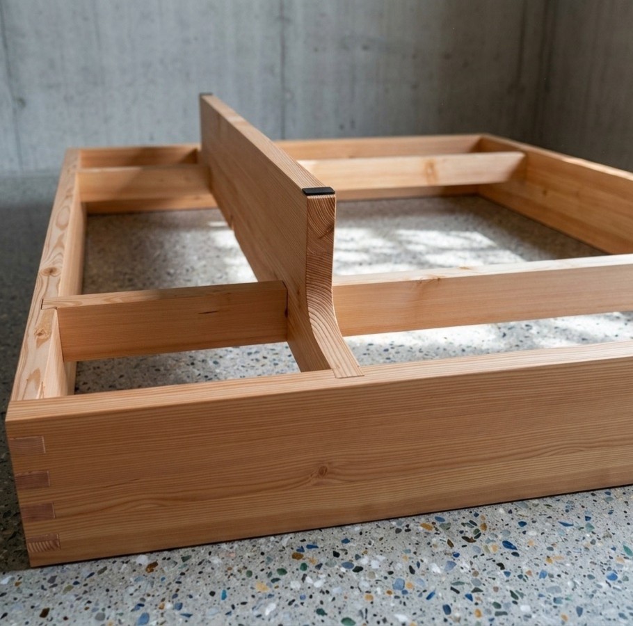 Stattdessen vertrauen wir ausschließlich traditionellen Holzverbindungen, die hier perfektioniert wurden – mit modernem Blick neu interpretiert und millimetergenau umgesetzt. Präzise Zapfen, Schwalbenschwänze, Fingerzinken greifen so ineinander, dass sie sich gegenseitig verriegeln und mit jedem Tag stabiler werden. Die Konstruktion lebt mit dem Holz: Sie atmet, arbeitet und bleibt dennoch bombenfest.