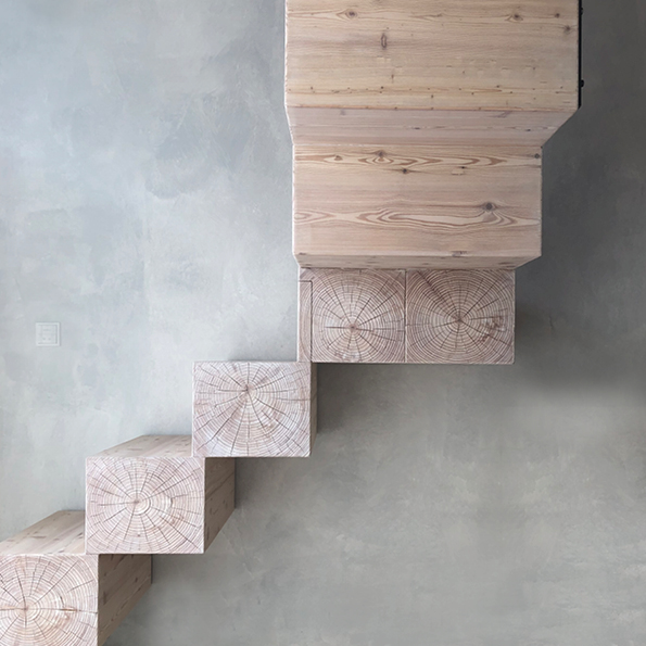Massivholzkonstruktion: Gefertigt aus geschachtelten 3-Schichtplatten aus Lärchenholz, die das Bild gestapelter Balken erzeugen. Hirnholz (die natürliche Stirnseite) wird bewusst sichtbar gemacht und zeigt den authentischen Charakter des Holzes.